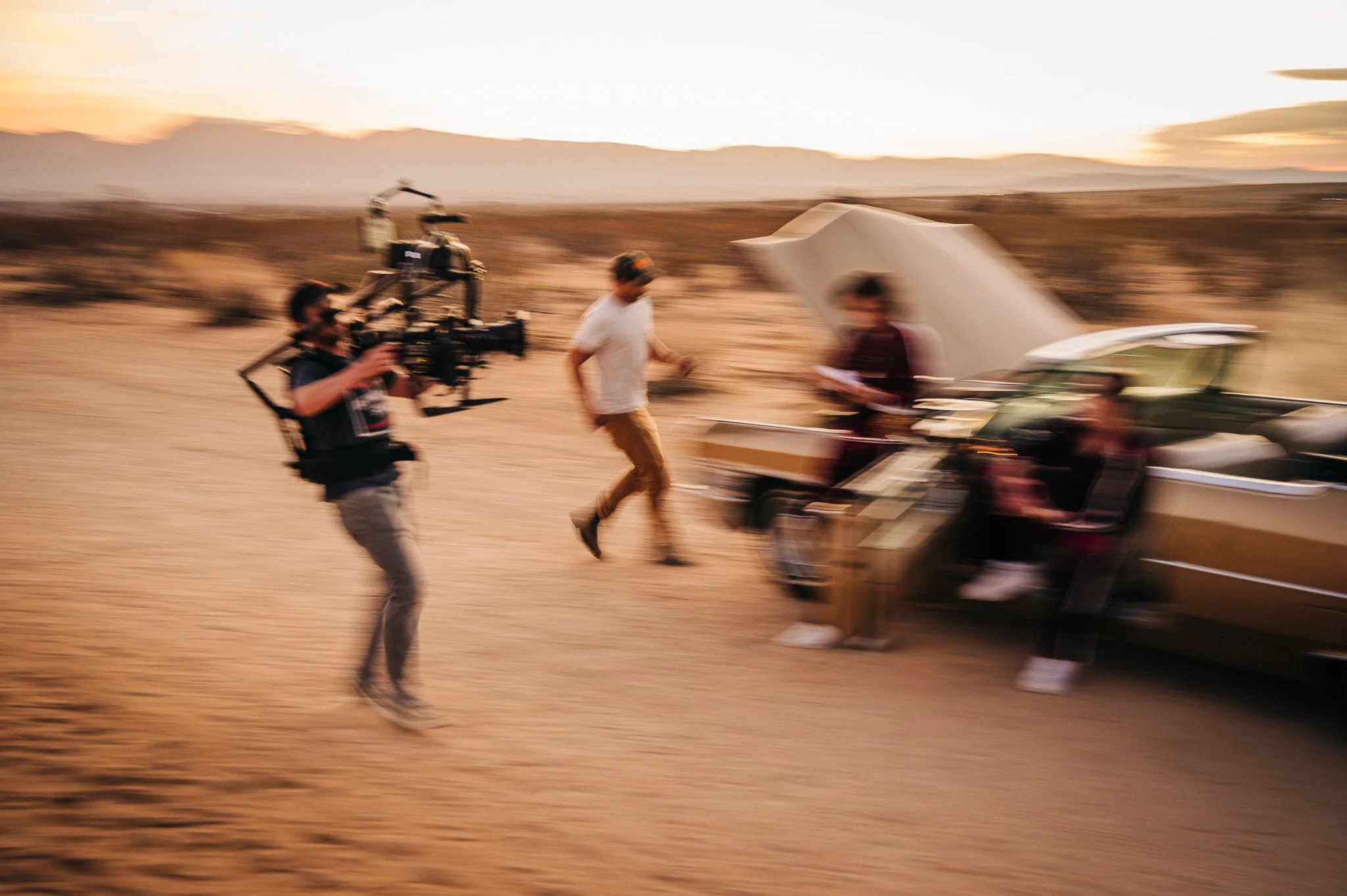 Like I said, it’s not a real Watsky shoot until something goes wrong, and we didn’t have to wait long for that to happen. The picture car rolled onto set not long after we arrived and had built the camera in the back of Gwiz’s pickup truck, and the plan was to shoot with it first. But as we went to move it into position, it would not start. Classic. The men all gathered around and looked under the hood and put their hands on their hips, trying to figure out what was wrong with the car, but the majority were Emerson College grads, and the school is not known for its automotive degrees. The irony is, the music video was about a couple whose car breaks down, ours just broke down a little ahead of schedule. But the show must go on. The crew ended up pushing the car around the desert for the day, chasing the light, and making movie magic.